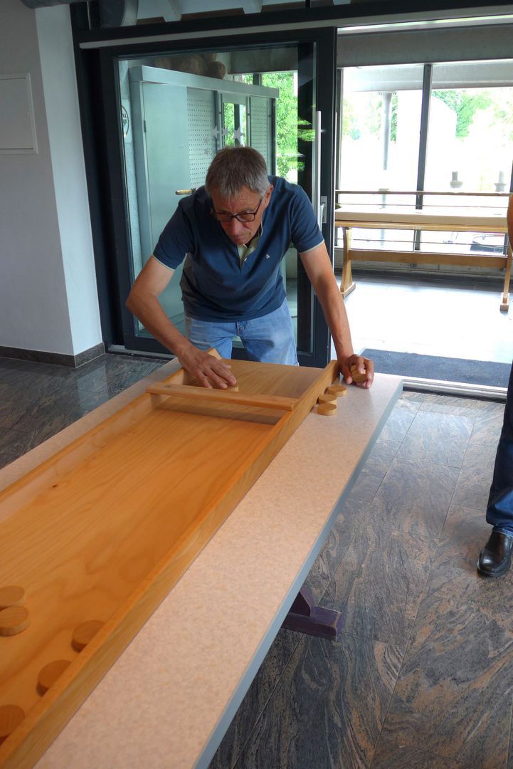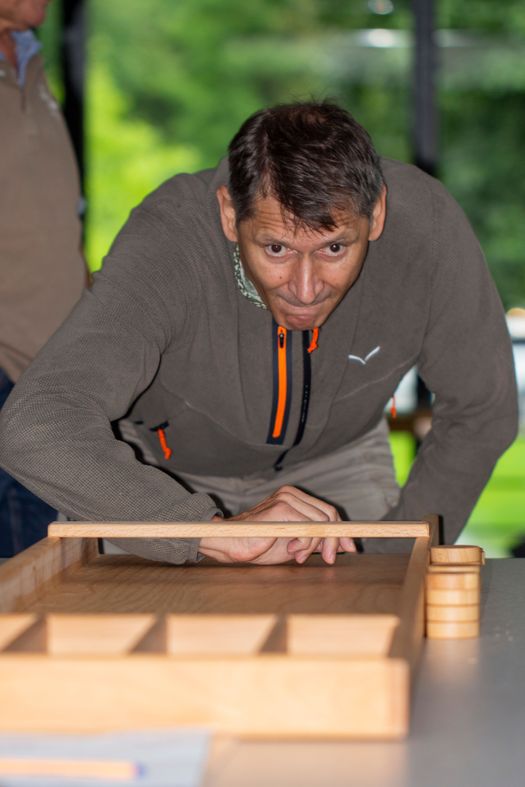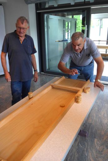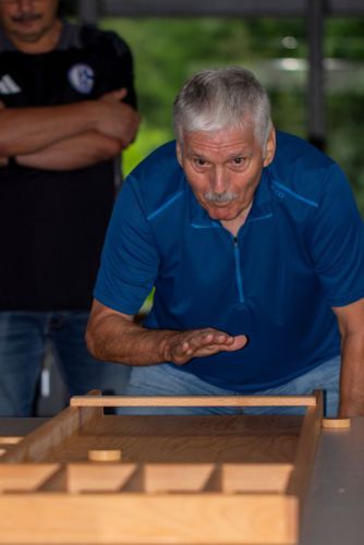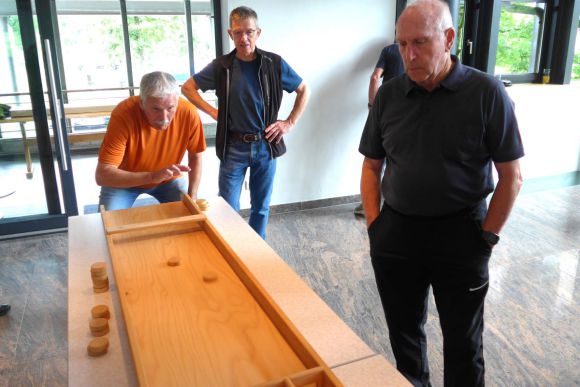 Am 30.7.2025 wollten wir auf dem alten Sportplatz in Endersbach Billitz spielen. Wegen andauerndem Starkregen sind wir bei Halim unters Dach und haben Schuffleboard gespielt. Nach 3 hart umkämpften Spielen gewann das Team Rainer A., Hartmut, Armin, Walther und Stefan H. mit 2:1 (151:74, 167:131, 50:73)